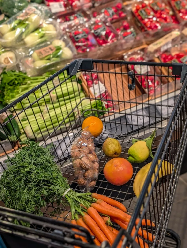 Getty Images: Shopping cart in a supermarket filled with fresh groceries for healthy eating